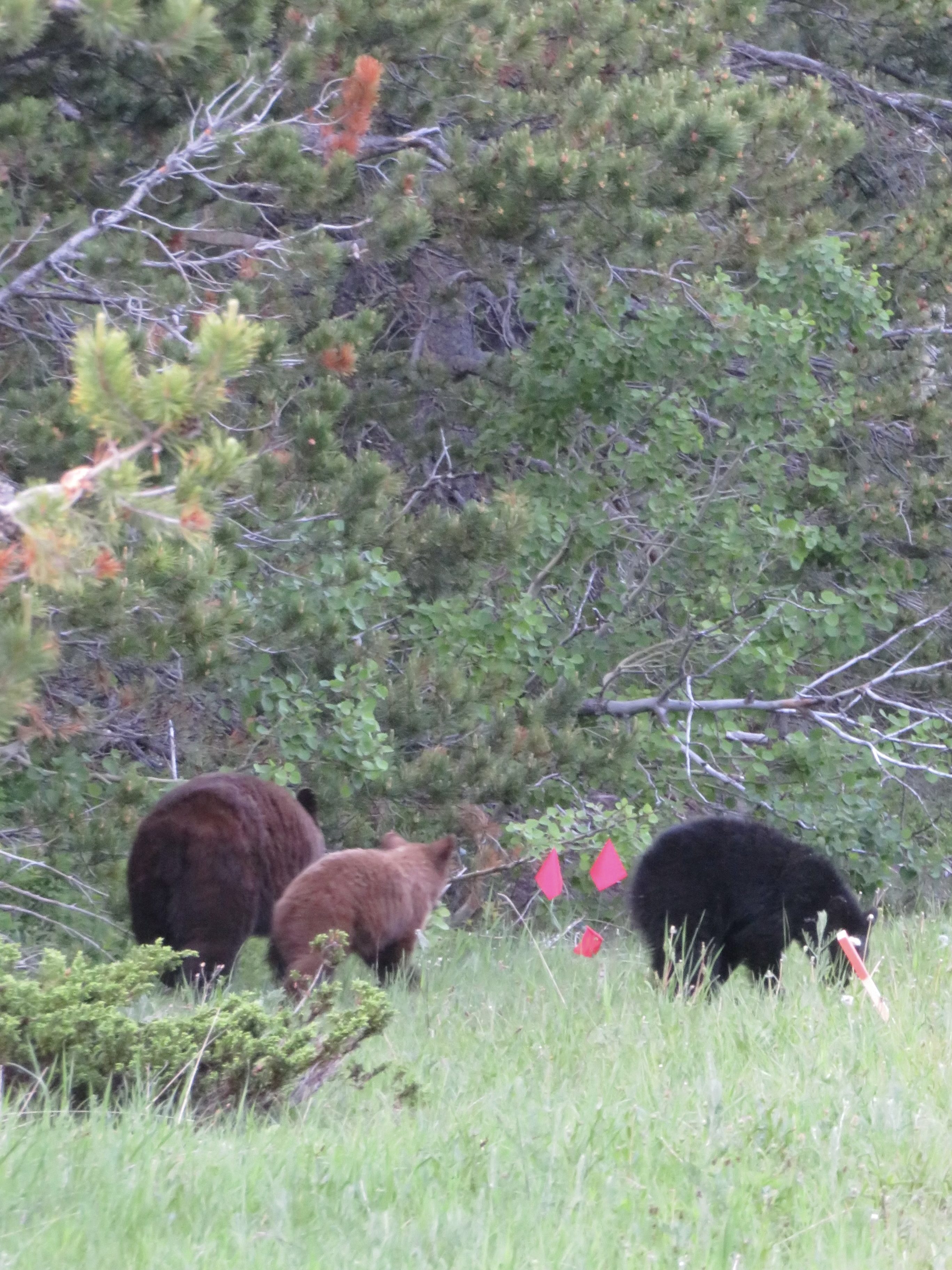 Bears are most active at dusk and dawn. The easiest way to spot a bear is by taking a drive through the park at sunrise or sunset. I have frequently seen bears while driving the Going-to-the-Sun-Road alongside Saint Mary Lake or on the road into Many Glacier alongside Lake Sherburne. (Of course, living in Many Glacier means I was in the East side of the park far more often than the West.) On a boat tour with Glacier Park Boat Company, we spotted a bear on the mountainside above Lake Josephine. The guide told me that bears tend to hang out in avalanche chutes where berry bushes grow plentiful, and they saw bears daily on the Many Glacier boat tour that summer.