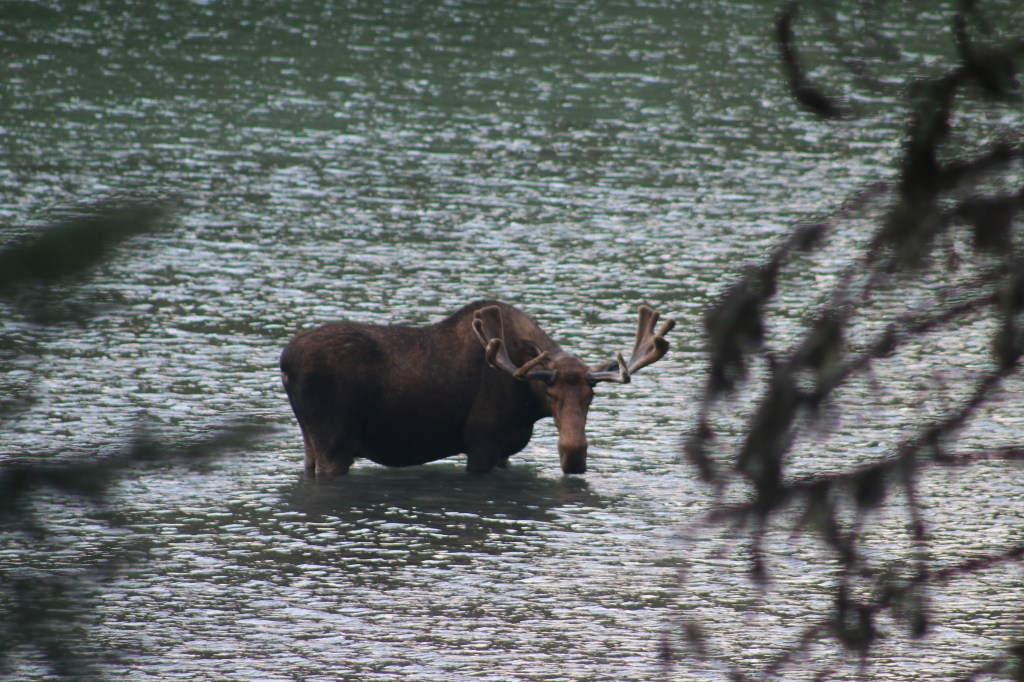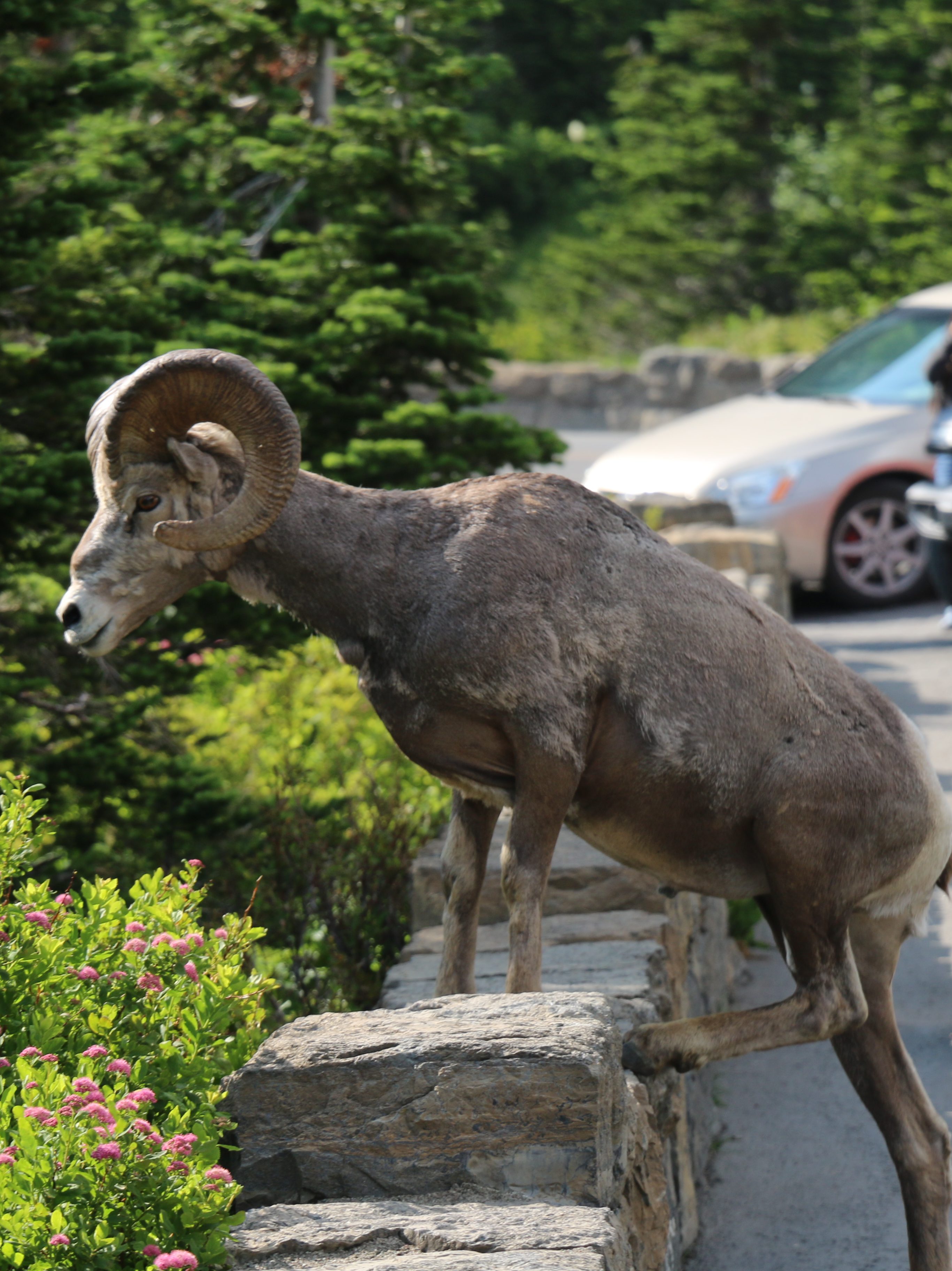 Bighorn Sheep were as common at Many Glacier Hotel as deer in my backyard in Wisconsin. In May and early June, before the property was bustling with tourists, bighorn sheep would hang around the hotel all day long. They might stand right outside the windows of the Ptarmigan Dining Room while guests ate lunch. However, as the high-season crowds push bighorn sheep deeper into the park, you have to put in a little more effort to see them. Bighorn sheep are typically found at higher elevations than bears and moose. They often roam around Logan Pass, the highest point on the Going-to-the-Sun-Road. Any of the hiking trails at Logan Pass could lead to bighorn sheep.
