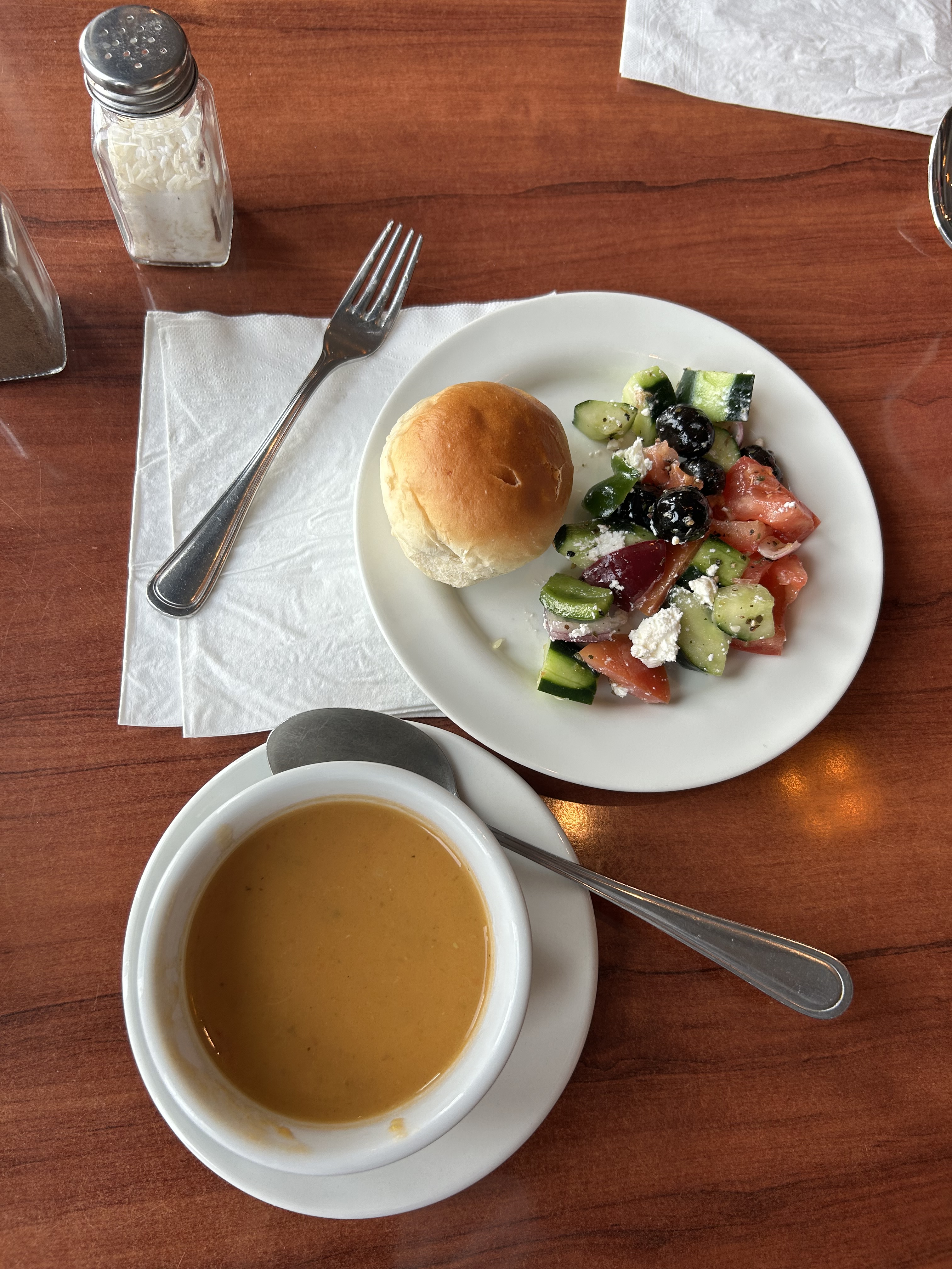 Lunch and dinner always had fruit*, a salad bar, soup, and bread. There were usually 4-5 options on the hot bar that changed every day. There was also a dessert, which was almost always cake.