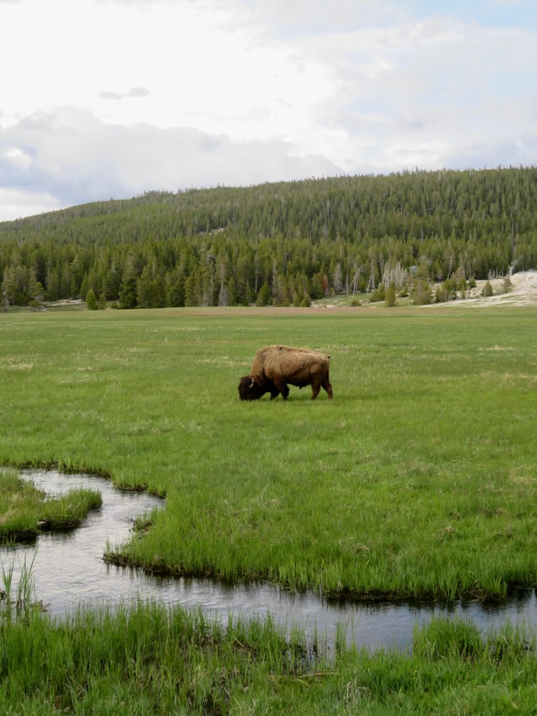 Of course, most visitors’ favorite part of Yellowstone National Park is the wildlife. You’re pretty much guaranteed to see bison, and you also might also spot a moose, elk, wolf, grizzly, or black bear. Bears are frequently spotted in Lamar Valley and Hayden Valley, but I didn’t see any on this trip. (Fortunately, I had seen moose and bears the previous day in Grand Teton National Park.) I did spot a wolf on my drive out of the North Entrance near Lamar Valley.