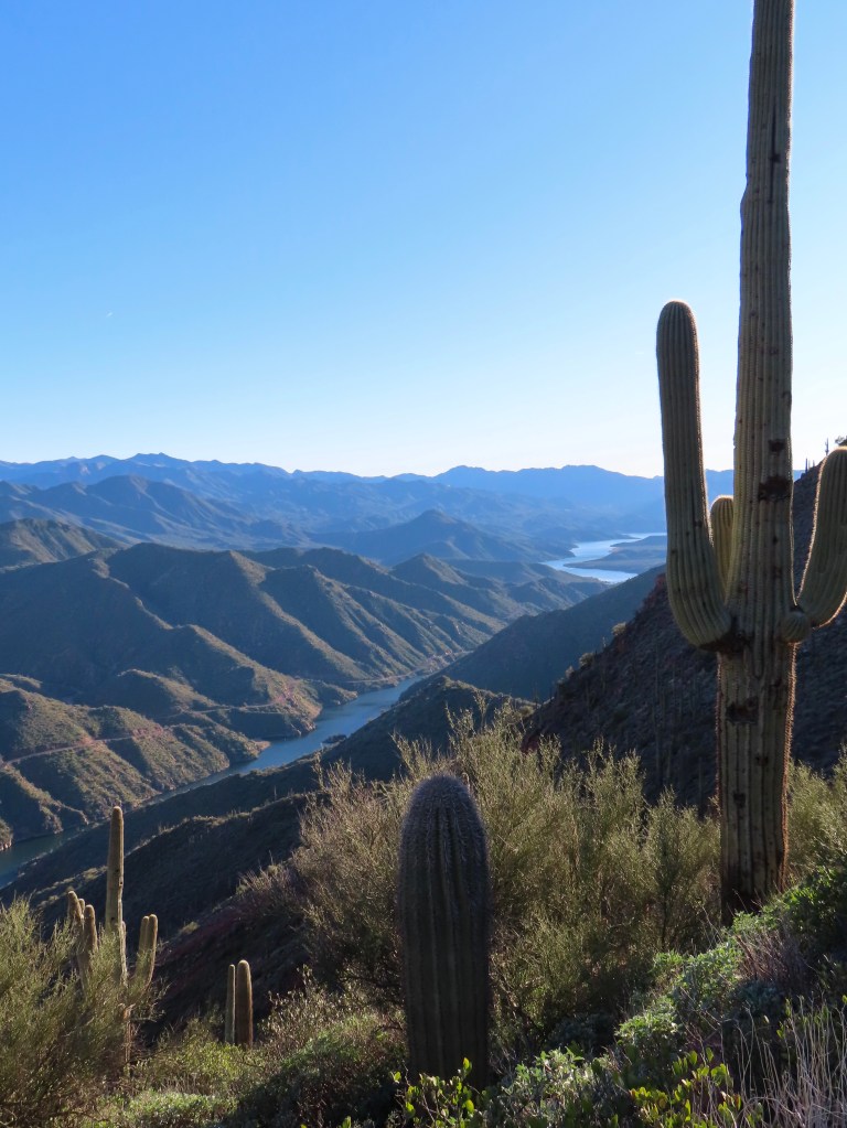This trailhead is a two-hour drive from central Phoenix, beginning at Theodore Roosevelt Lake and heading into the Four Peaks area. The beginning of the trail overlooks Theodore Roosevelt Lake, including the iconic bridge and dam, ascending Vineyard Peak to overlook the Salt River Valley (pictured above at mile 2). You could turn back here for a 4-mile roundtrip, but my suggested distance is mile 3.5 (7 miles roundtrip) for more incredible Salt River Valley and Four Peaks views.