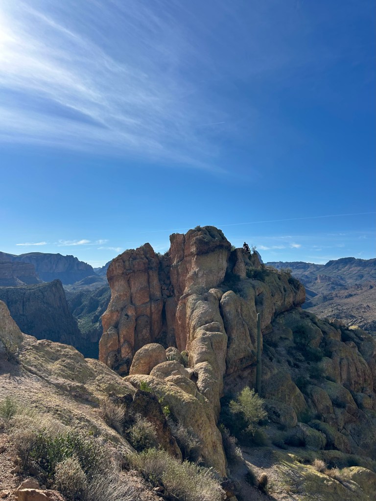 Battleship Mountain scramble is tougher and more exposed than Flatiron, so don’t attempt it until you’ve gotten experience on other scrambling routes! It’s an iconic Superstitions landmark with incredible views, if you’re not afraid of heights.